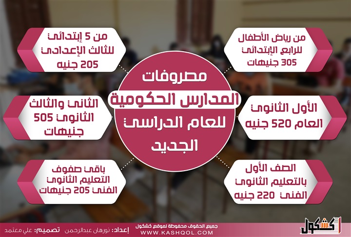 ينشر "كشكول" إنفوجرافا بشأن مصروفات المدارس الحكومية للعام الدراسي الجديد كالتالي: