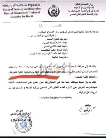 جاء ذلك في إشارة من الإدارة العامة للتعليم الفني الصحي إلى وكيل وزارة الصحة والسكان؛ إدارة التدريب والمدارس