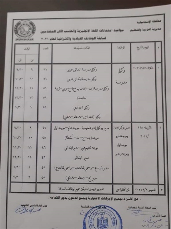 أعلنت مديرية التربية والتعليم بالإسماعيلية برئاسة طه عجلان وكيل وزارة التربية والتعليم بالإسماعيلية عن بدء اختبارات المتقدمين لشغل الوظائف الإشرافية في مادتي الحاسب الآلي واللغة الإنجليزية الثلاثاء القادم.