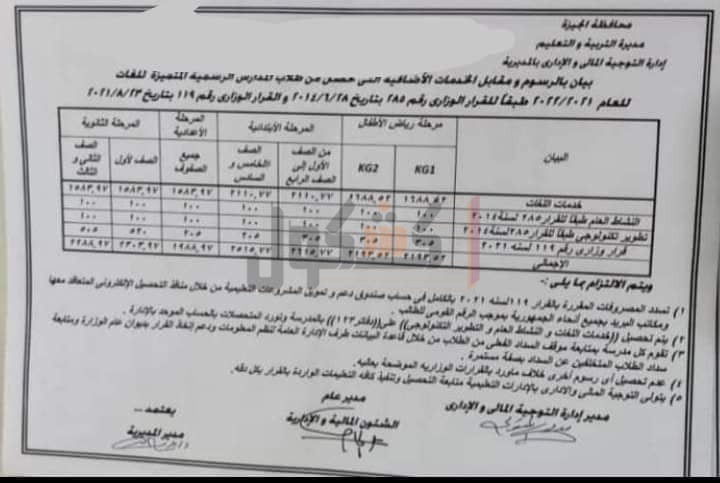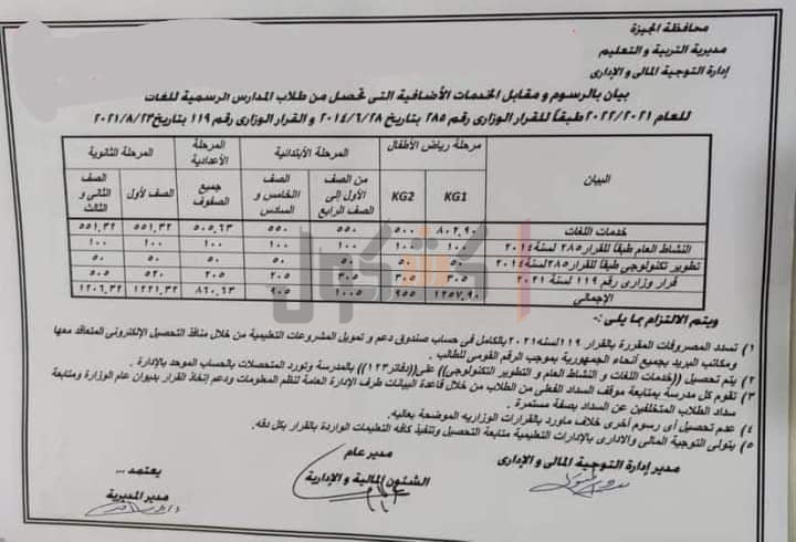 المدارس والإدارات بعدم تحصيل أي رسوم أخرى، خلاف ما ورد بالقرارات الوزارية الموضحة