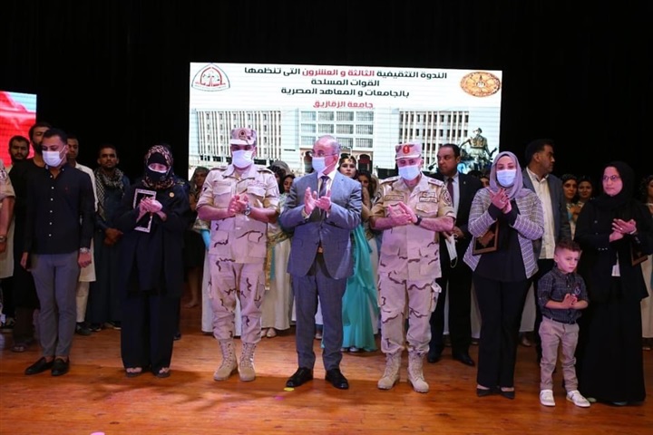 استضافت اليوم، جامعة الزقازيق فعاليات الندوة التثقيفية الثالثة والعشرين للقوات المسلحة والتي نظمتها قيادة قوات الدفاع الشعبى والعسكرى في إطار حرص القيادة العامة للقوات المسلحة على تنمية روح الولاء والإنتماء والدور التثقيفي والتنويري الذي تقوم به الجامعة، بحضور اللواء أركان حرب عماد أحمد زكي قائد قوات الدفاع الشعبي والعسكري، والدكتور عثمان شعلان رئيس جامعة الزقازيق، واللواء أسامة الجمال مستشار أكاديمية ناصر العسكرية، والعميد ياسر محجوب قائد الفرقة السادسة مدرعة، والعميد محمد منصور المستشار العسكري لمحافظة الشرقية، والعميد تامر أحمد ماهر مدير مكتب المخابرات الحربية بالشرقية، والعقيد أحمد الجندي مكتب المخابرات الحربية بالشرقية، والمقدم مصطفى فراج مكتب الأمن القومي، ونواب رئيس الجامعة وعمداء ووكلاء الكليات والحضور الكريم من القيادات التنفيذية والشعبية بمحافظة الشرقية وعدد من أسر الشهداء والمصابين من القوات المسلحة والشرطة وطلاب وطالبات الجامعة.