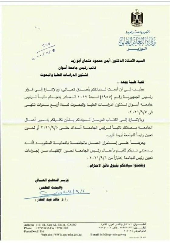 تقدم الدكتور أيمن محمود عثمان القائم بأعمال رئيس جامعة أسوان، بأسمى آيات الشكر والتقدير والعرفان للقيادة السياسية والقيادة الرشيدة لفخامة الرئيس عبد الفتاح السيسي رئيس الجمهورية، والشكر أيضا لدولة الدكتور مصطفى مدبولي رئيس مجلس الوزراء والدكتور خالد عبد الغفار وزير التعليم العالى والبحث العلمى لتجديد الثقة الغالية له قائمأ بأعمال رئيس جامعة أسوان بتاريخ 6/9/2021.