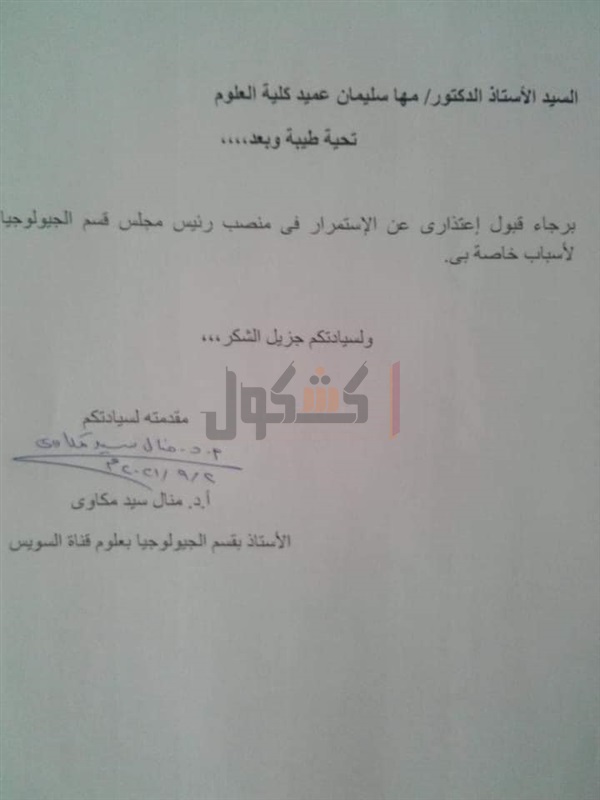 بكلية العلوم بجامعة قناة السويس حول استقالتها من رئاسة قسم الجيولوجيا بالكلية أوجعنى