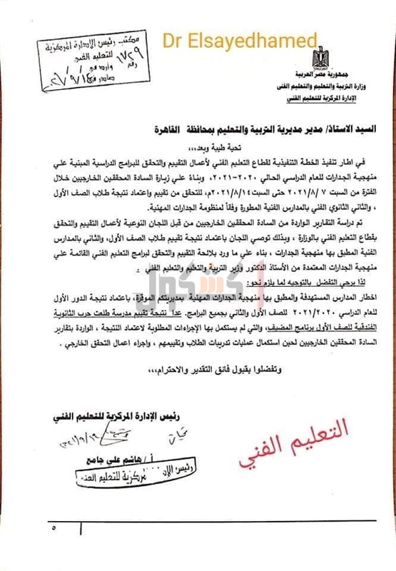 الصادر بتوقيع هاشم علي جامع، رئيس الادارة المركزية للتعليم الفني، على أنه في اطار