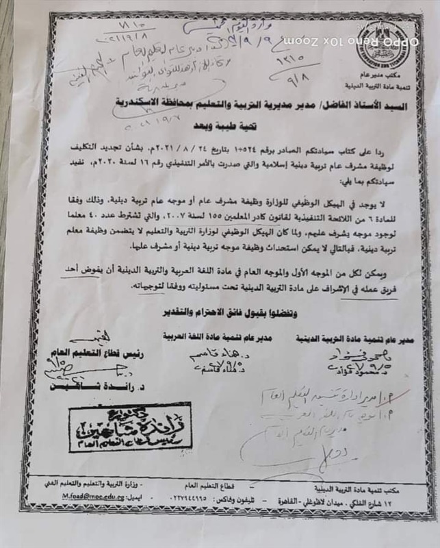 وجهت الدكتورة راندا شاهين، رئيس قطاع التعليم العام بوزارة التربية والتعليم والتعليم الفني، مديرية التربية والتعليم بالاسكندرية، منشورا بشأن الكتاب الدوري الصادر بتاريخ 24 أغسطس 2021، وتجديد التكليف لوظيفة مشرف عام تربية دينية إسلامية والتي صدرت بالأمر التنفيذي رقم 16 لسنة 2020.
