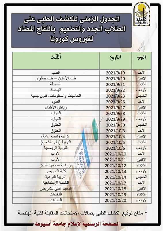 19/10 والأربعاء 20/10 لجميع الطلاب المتخلفين عن إجراءات الكشف الطبي من جميع الكليات،