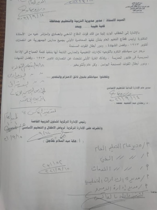 بشأن تنفيذ المحاضرة الأولى بجميع مدارس الجمهورية عن انتصارات أكتوبر ١٩٧٣، وفضل الشهادة