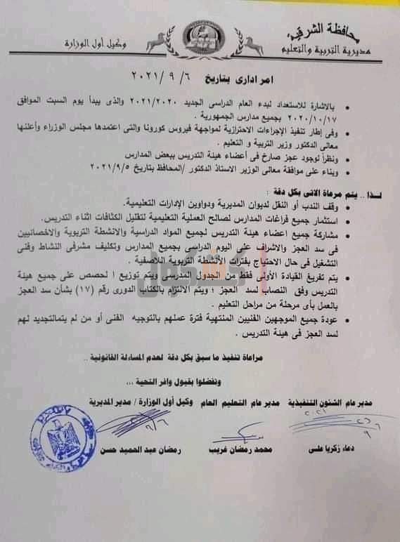أصدرت مديرية التربية والتعليم بالشرقية أمر إداري، جاء فيه أنه بالإشارة