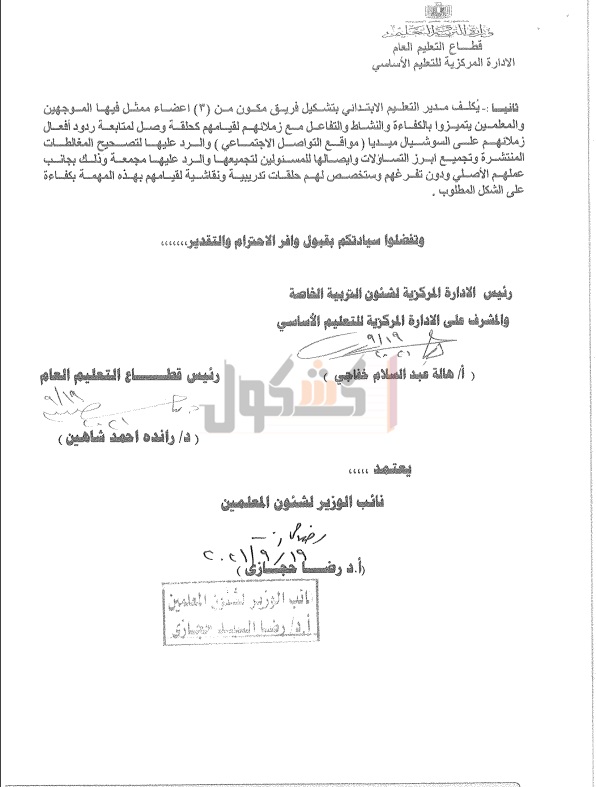 بتشكيل فريق مكون من 3 أعضاء ممثل فيها الموجهين والمعلمين يتميزوا بالكفاءة والنشاط