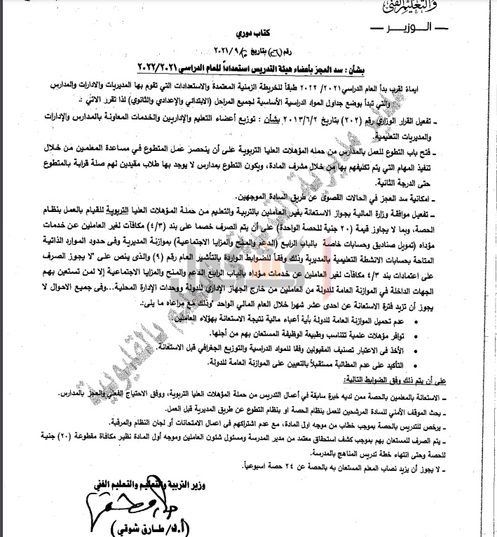 تزامنا مع ترقب أولياء الأمور لأحدث الأخبار والتفاصيل الخاصة ببدء الدراسة في العام الجديد، تزامنا مع تفشي فيروس كورونا المستجد، كشف خطاب حصل «كشكول» على صورة منه خطة وزارة التربية والتعليم والتعليم الفني، بشأن سد العجز بأعضاء هيئة التدريس استعدادًا للعام الدراسي الـ2021_ 2022، وذلك لقرب بدء الدراسة، وقررت الآتي: