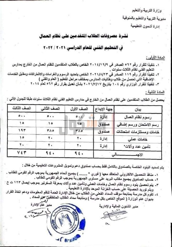 مصروفات الطلاب المتقدمين على نظام العمال بالتعليم الفني 2021_ 2022
