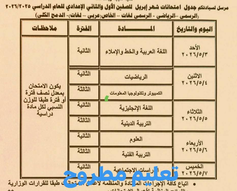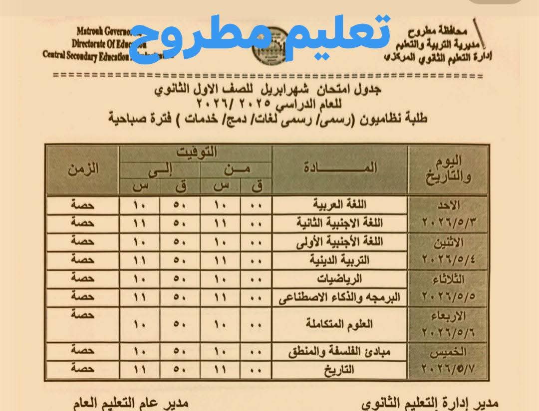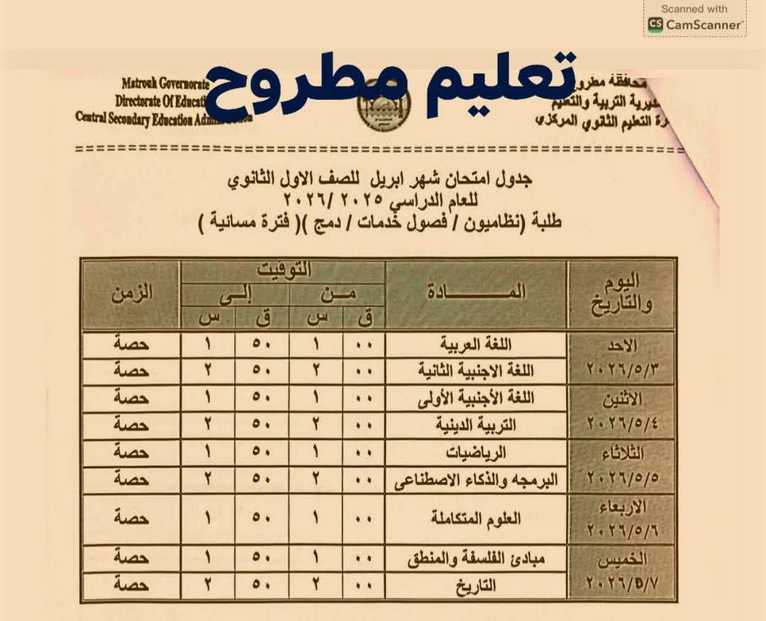 < جداول امتحانات شهر إبريل 2026 لطلاب صفوف النقل بمطروح