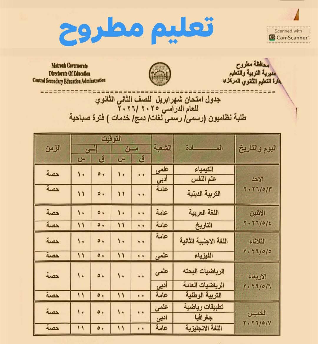 جداول امتحانات شهر إبريل 2026 لطلاب صفوف النقل بمطروح